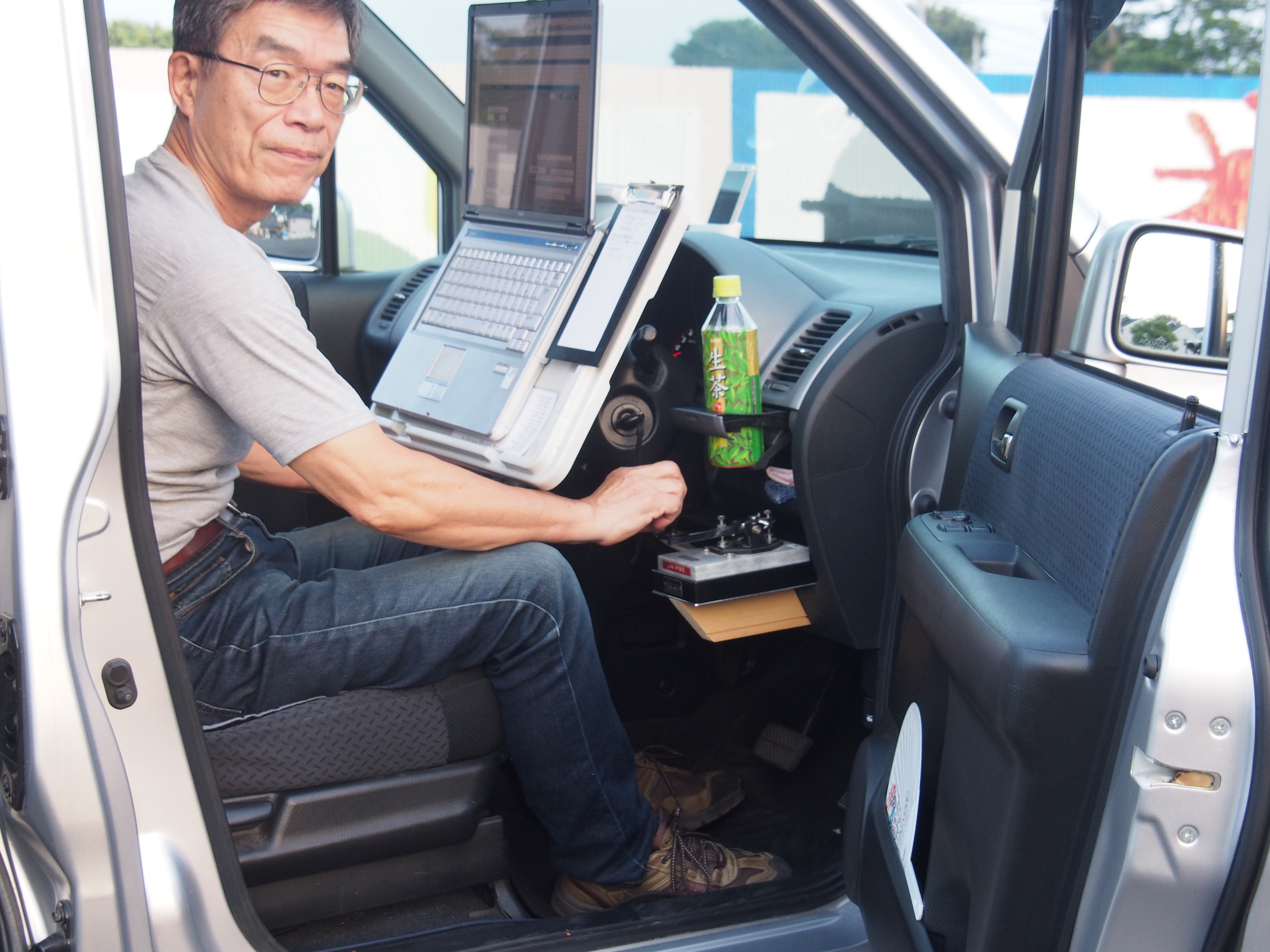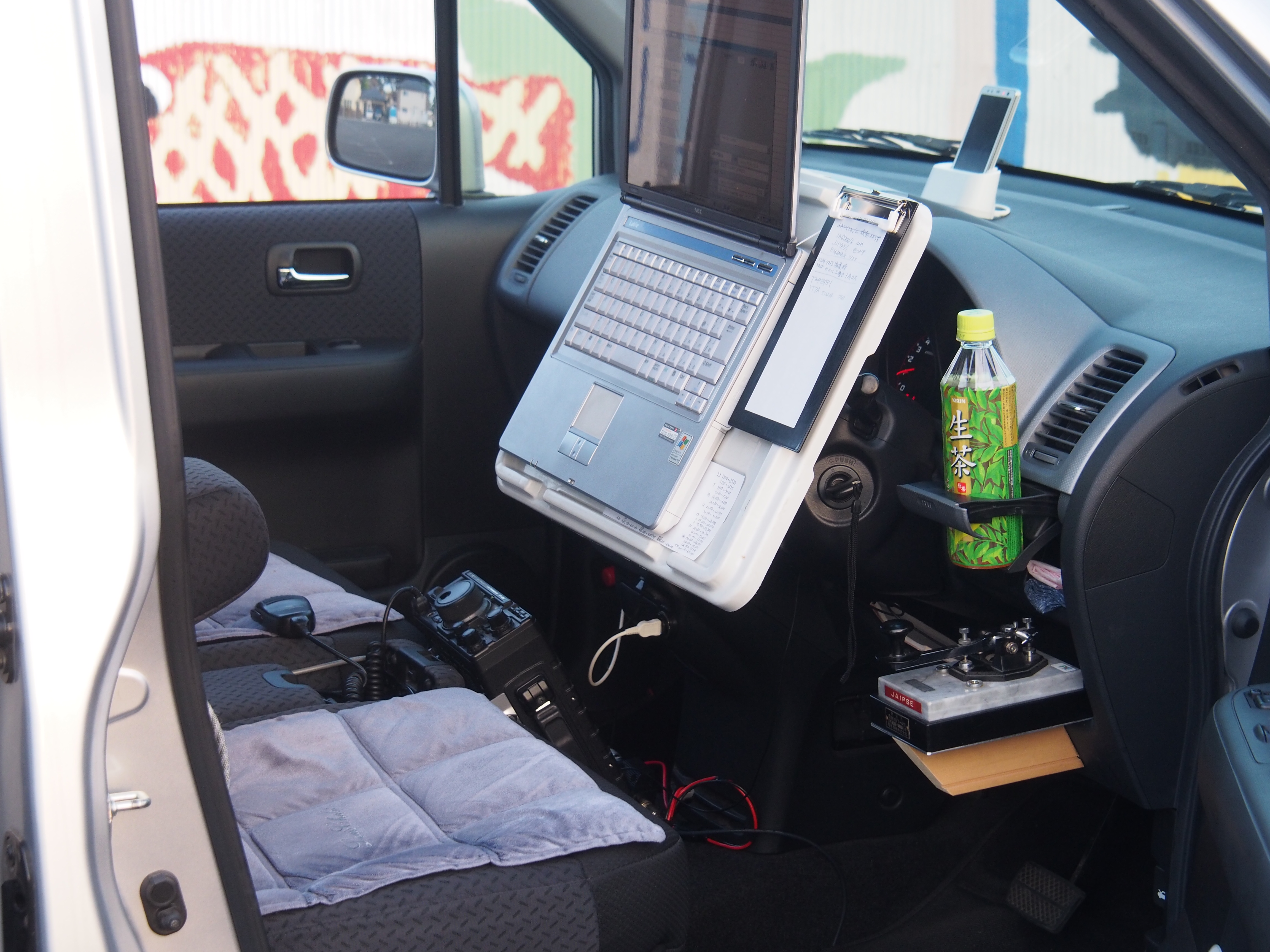 ・無線機は助手席との間に、ログ用パソコンはハンドルに吊り下げ