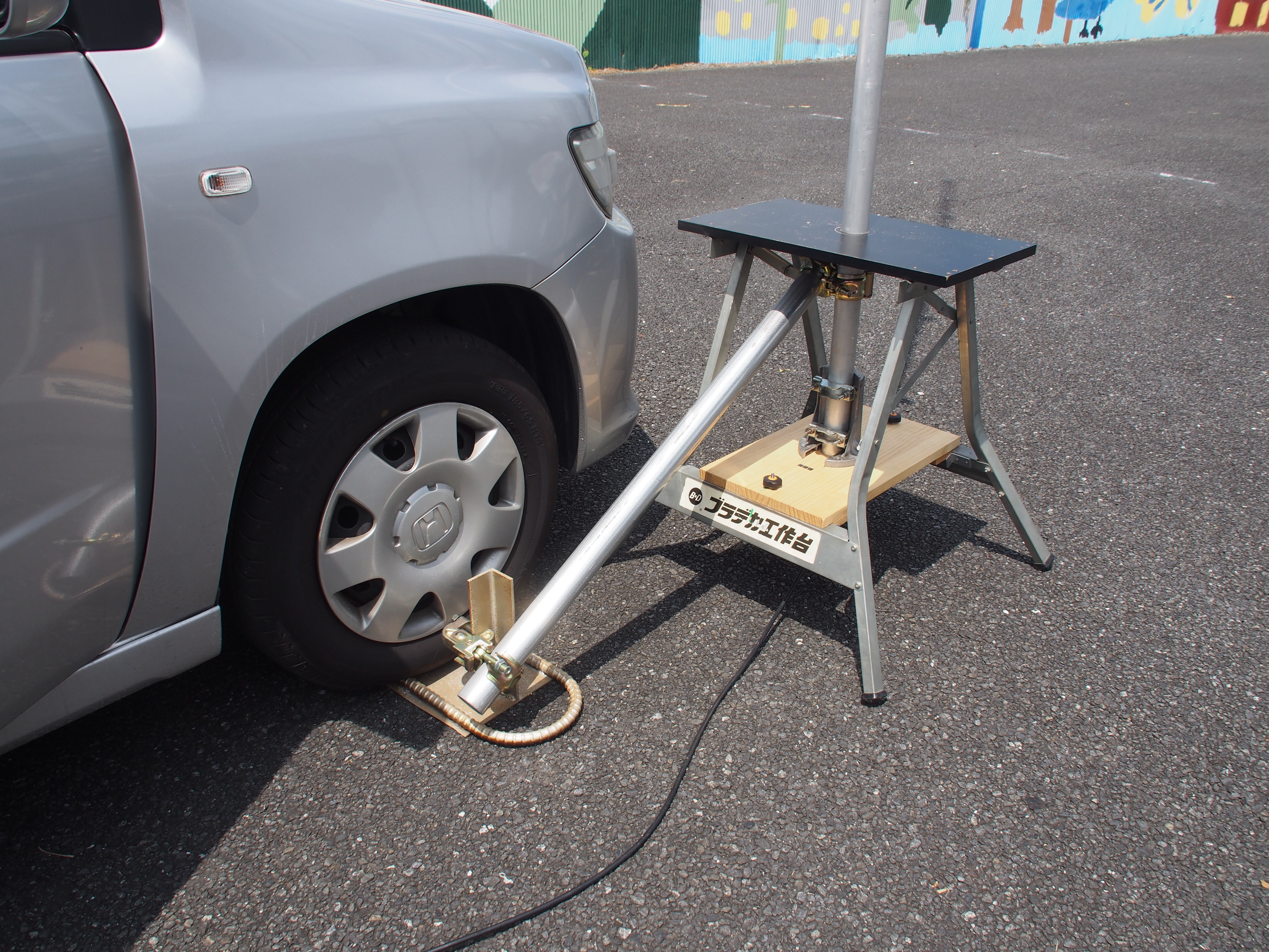 ・マストの下部は改造した工作台に取付け、友人作のタイヤベースに連結し転倒防止