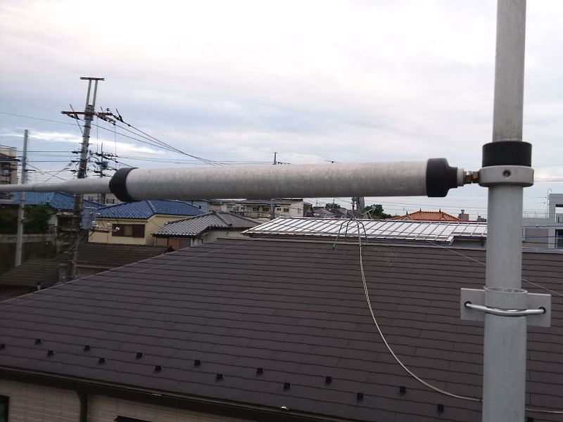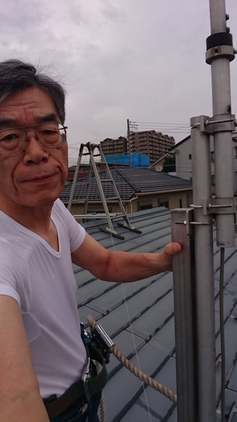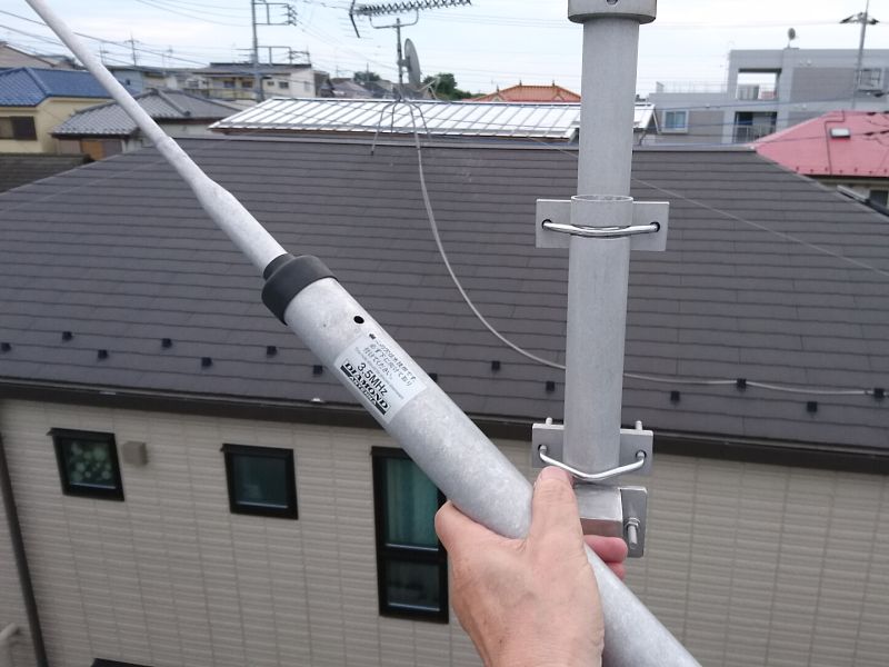 ステンレスの梯子に取り付けてあった調子の悪いHF2バンドアンテナCP8040を朝涼しいうちに屋根に上がって下ろした。