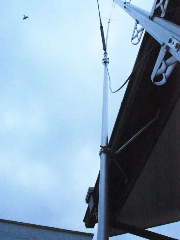 CP8040(3.5-7MHzGP)のマストの揺れを軽減するためにアルミパイプで鼻隠しに対してステーをとった。角度を合わせる加工が難しかったがなんとかクリア。