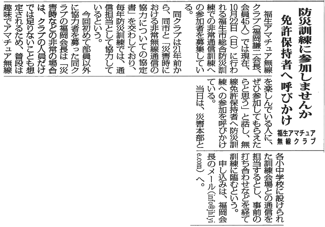 福生市総合防災訓練・非常通信訓練へのアマチュア局の参加呼びかけが西多摩新聞9月22日号の第3面に掲載されました。