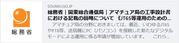 関東総合通信局から アマチュア局の工事設計書における記載の簡略について 《JT65等運用のための適合表示無線設備への付属装置追加手続の簡素化》が公表されました 。