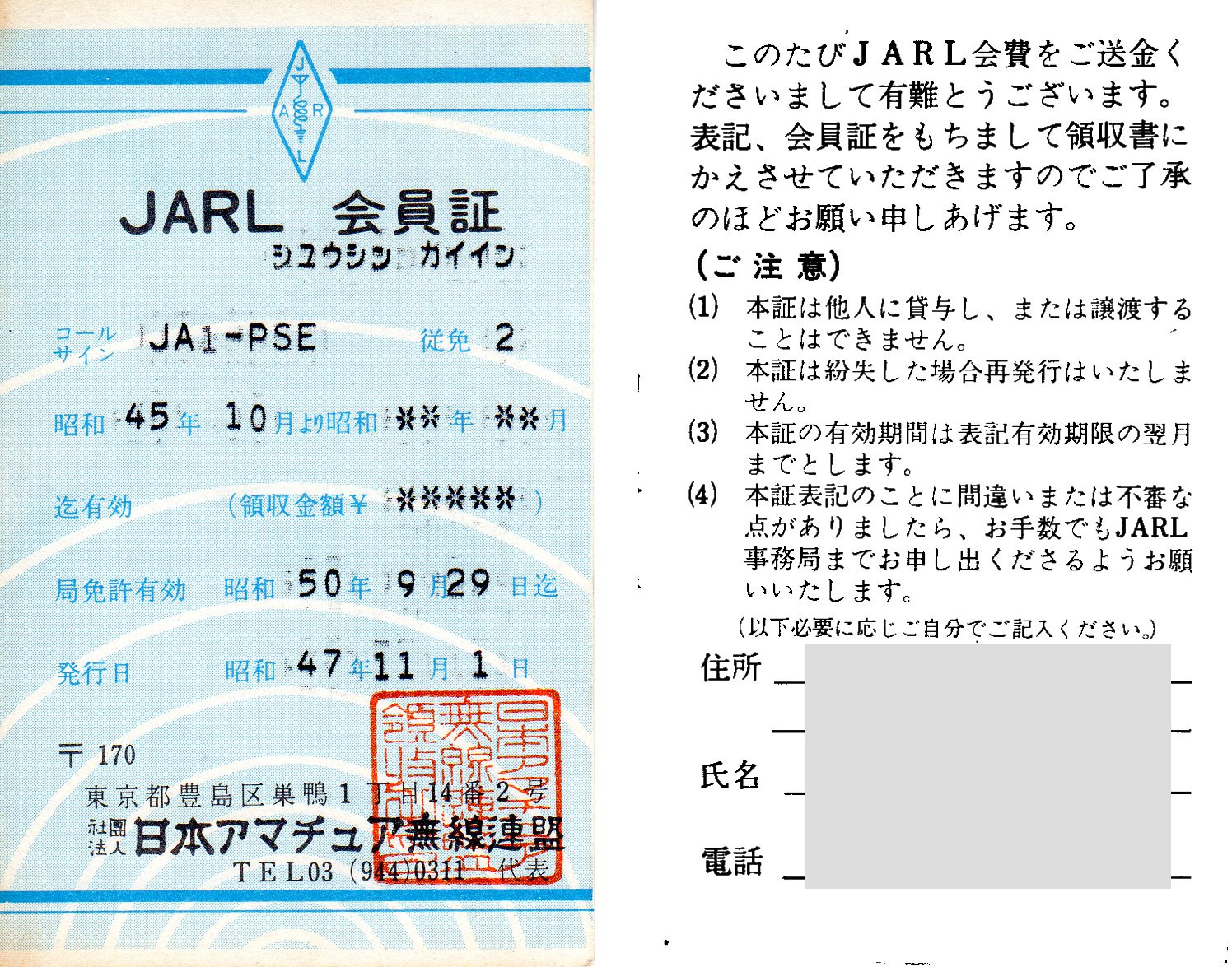 ひょんなことでJARL終身会員証が出てきた。