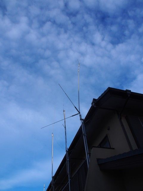 具体的には嵐が去ったあと、気がついたら50MHzの受信感度が極端に下がったのみならず、全く飛ばない。ラジアルに相当する追加した垂直エレメント(カウンタポイズ)がマストに接近してしまってVSWRも論外に高くなってしまっていた。(青空の写真)