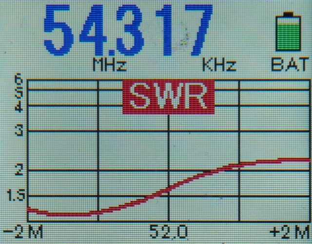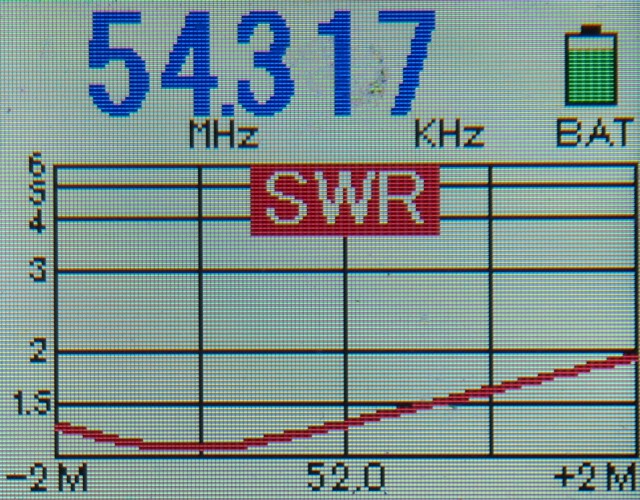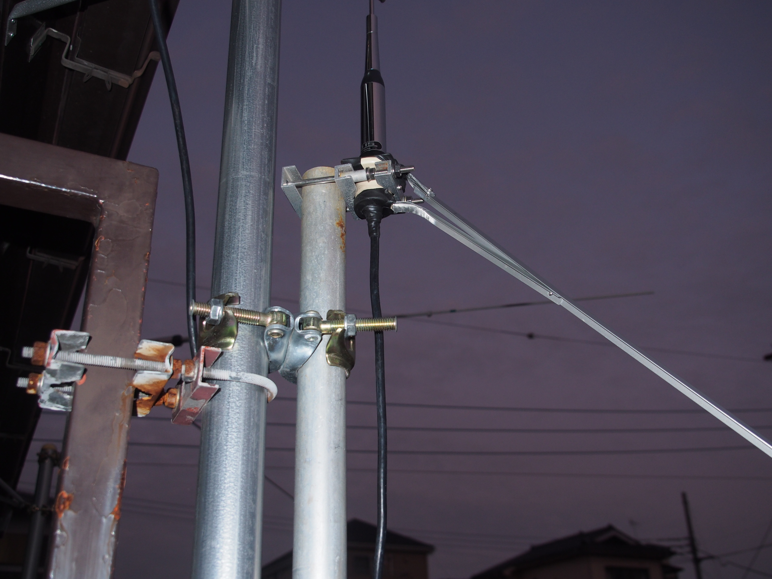 アンテナとして復旧し、ベランダ手元の高さでの VSWR を測定した。追加している下側エレメントは撮影アングルの関係で水平に近く見えるかもしれないが、実際はマストに対して45度程度となっている。その意味ではいわゆるラジアルエレメントと呼んでも良い。