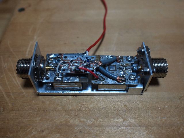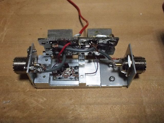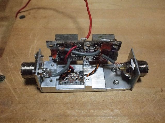 そこでリレー基板を裏返しに配置し、不整合部分を減らし不要な輻射や結合を減らすべくコネクタの中心導体および外部導体を基板に直接はんだ付けした。この写真はプリアンプを取り付ける前の状態である。