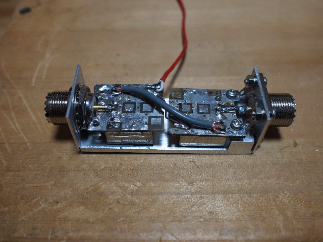 入出力の同軸コネクタも含めて取り付けるためにアルミ加工に手間取ったが、次の2枚の写真は第1次の試作である。(写真はクリックで拡大)