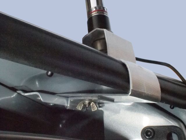 今回、車を入れ替え(Honda STEPWGN)たが、従来のように取り付けるのはむつかしそうだった。スライドドアの上部レールの付近にすきまがあったのでこれを利用して固定することにして試作したものが左の写真である。
