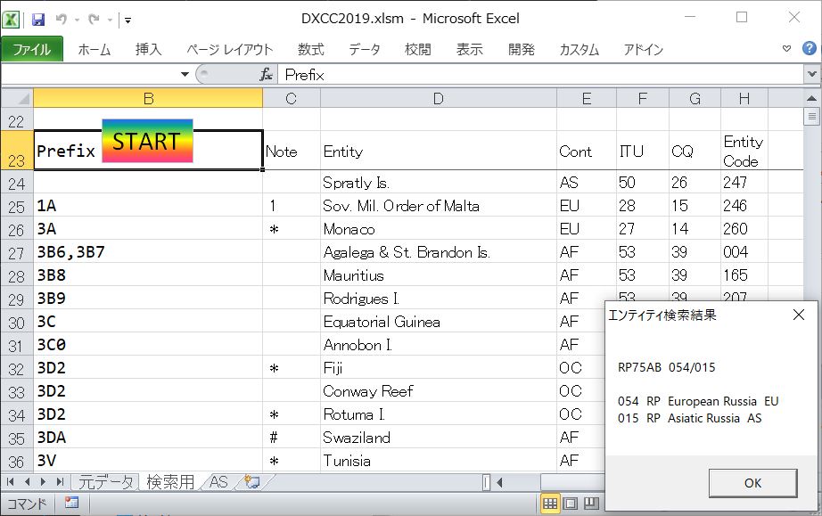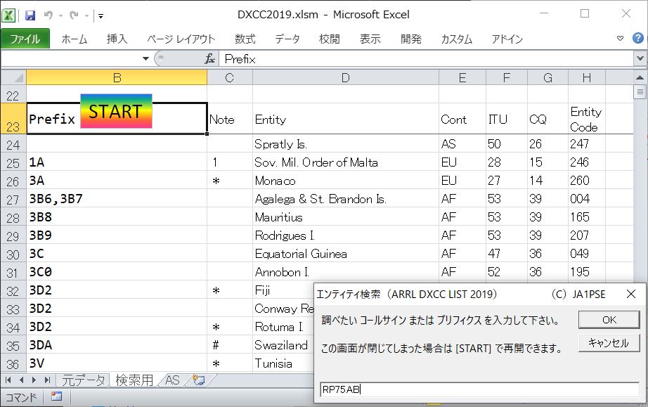 そこでARRL DXCC LIST Current Entities February 2019 Edition をベースにして、エンティティが検索できるソフトを Excel VBA により作成してみた。