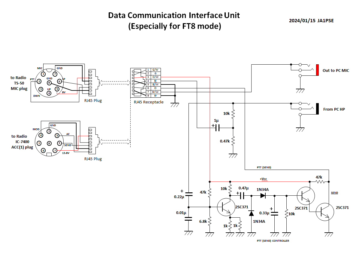 その時と本質的には何も変わっていないが、IC-7400を入手したので、インタフェースを作り直した。(それまで使用していたTS-50も接続できるようにしているが、動作確認はしていない)