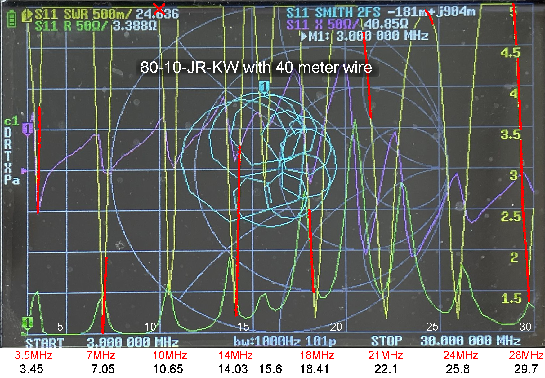 公称40メータのまま、80-10-JR-KWを通して半波長に対応するSWRのカーブから、最小値は 3.18MHz にて1.8弱であった。3.53MHzを狙うとすると 40m×3.18÷3.53=36mとなる。
