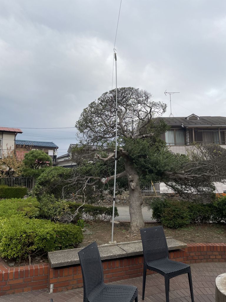 半波長エレメントの長さは購入時の公称40mで実測しなかったのは残念であった。会館3階の窓(推定地上高10m)から約45m先の高さ4mの伸縮ポールに向けて張った。途中地上はフラットで樹木その他の障害物等はない。