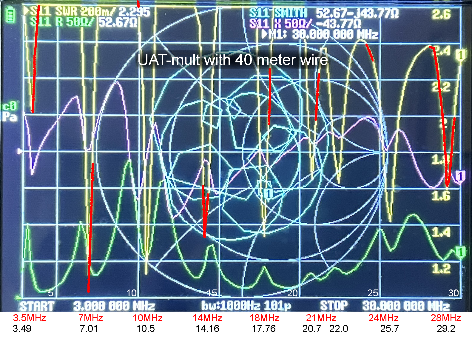 ところが 80-10-JR-KW の場合も UAT-mult の場合も必ずしも等間隔ではなく、理論的には存在しないはずの SWR のディップが見られる。その態様が異なることから、ワイヤのせいではなく、インピーダンス変換ユニットの関係で起きているのであろうかと思われる。