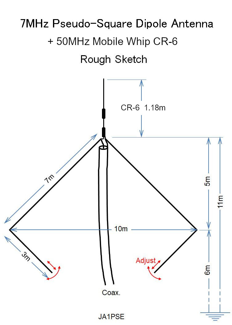 7MHz疑似方形ダイポールに50MHzモービルホイップを追加