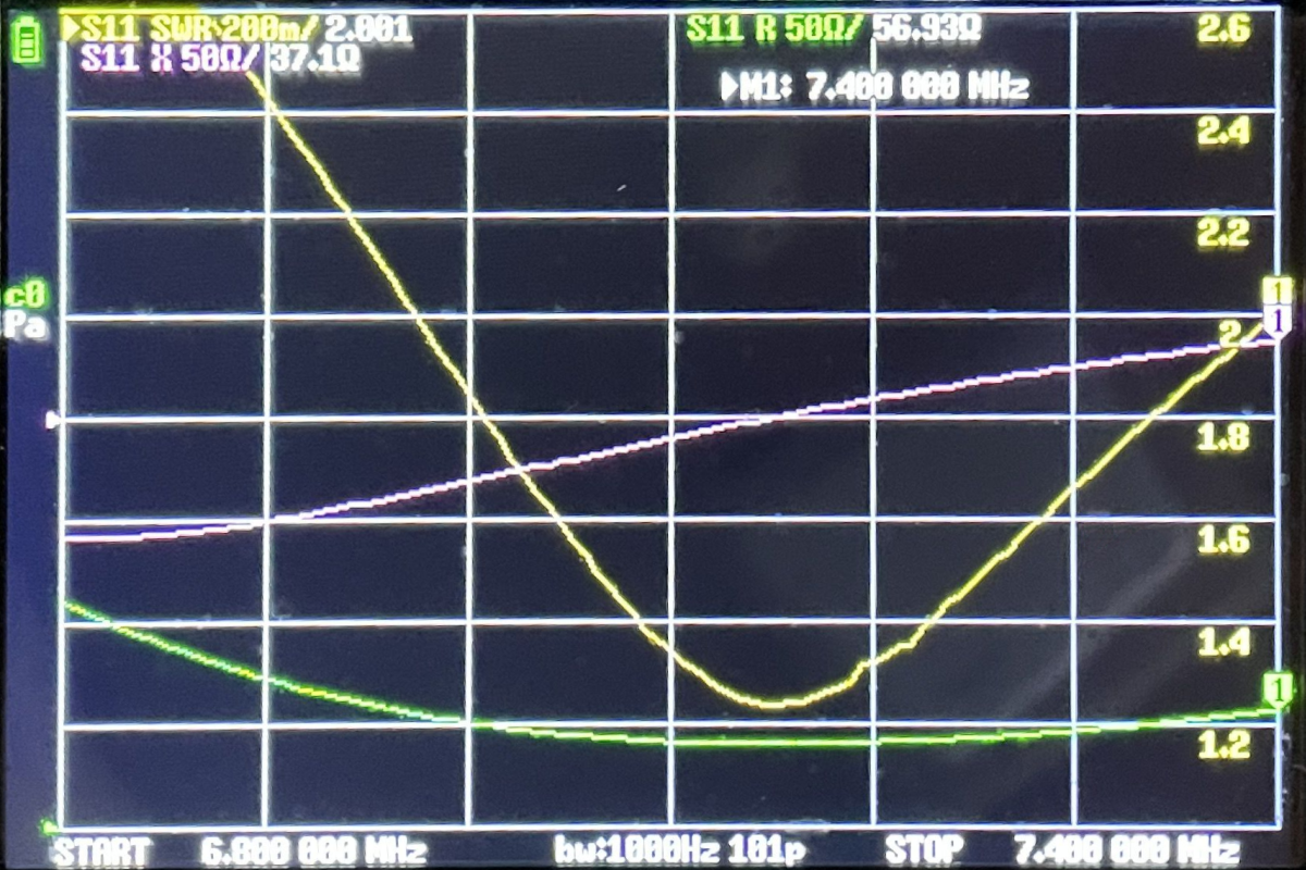 7MHz帯(6.8~7.4MHz)におけるSWR(黄トレース)
