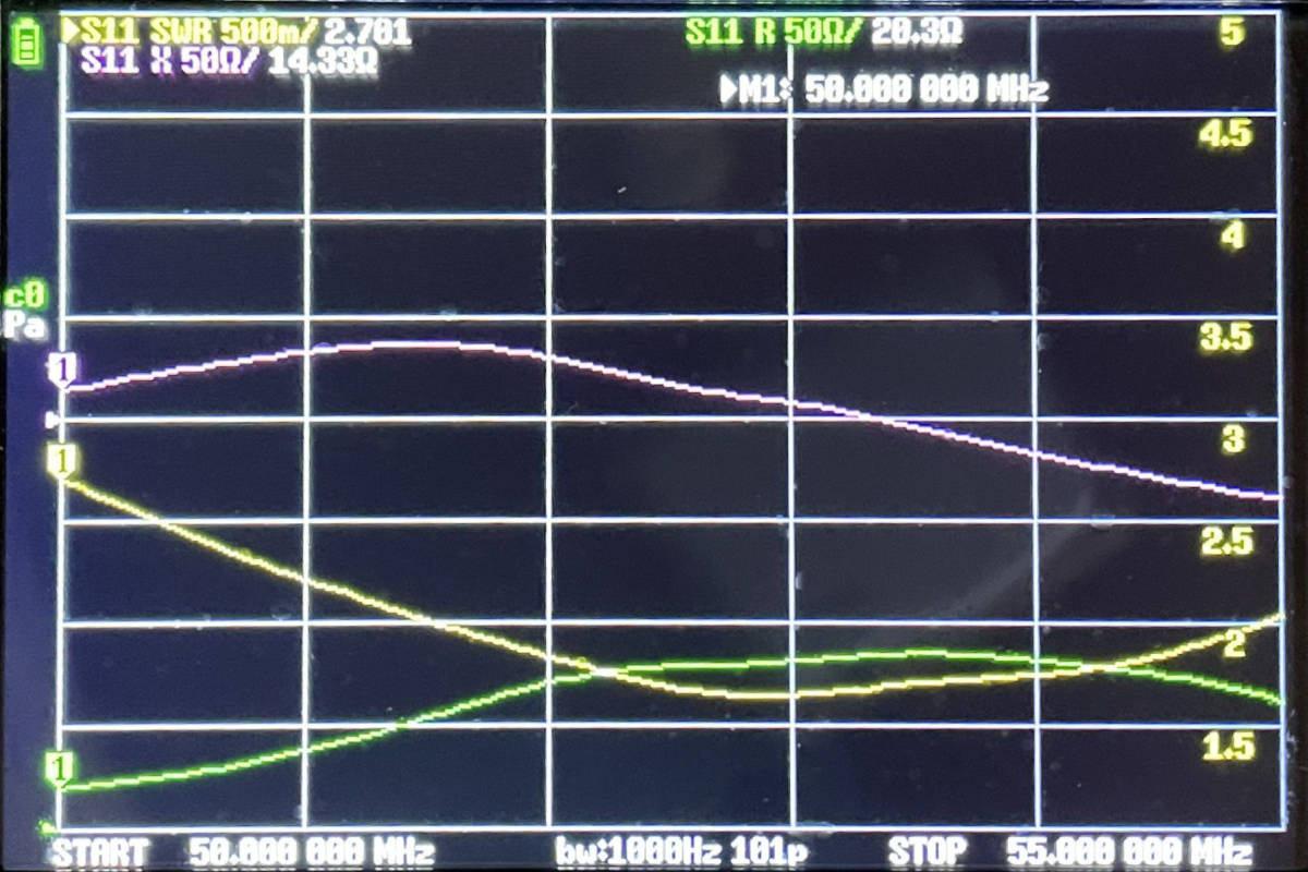 50MHz帯(50~55MHz)におけるSWR(黄トレース)