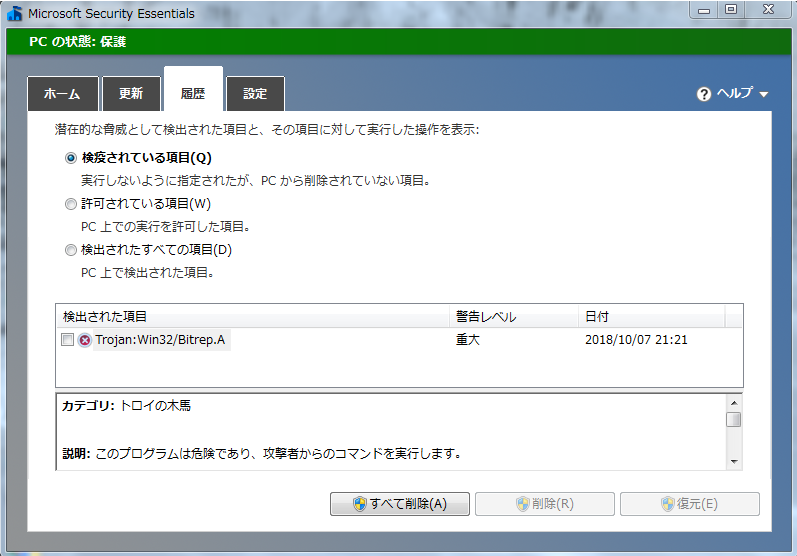調べてみたら Microsoft Security Essentials がトロイの木馬などのマルウェアを検疫していた。