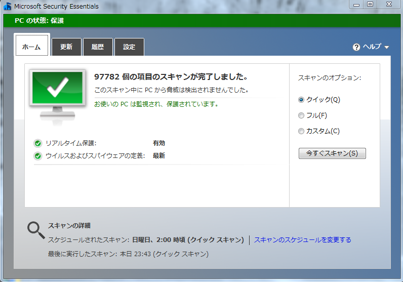 何をされているか分からないので念のためクイックスキャンをかけてみたところ異常なし。まあ良かった。 |