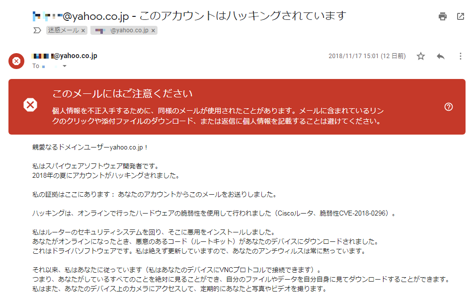 こんなメールが再び着信(背景赤の部分は受信に使用しているメールシステムによる警告)