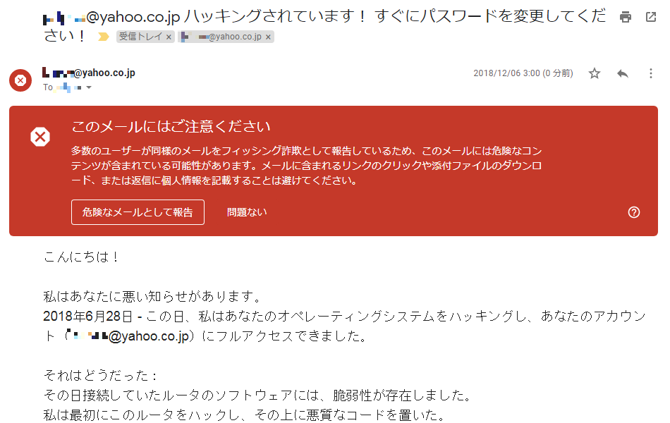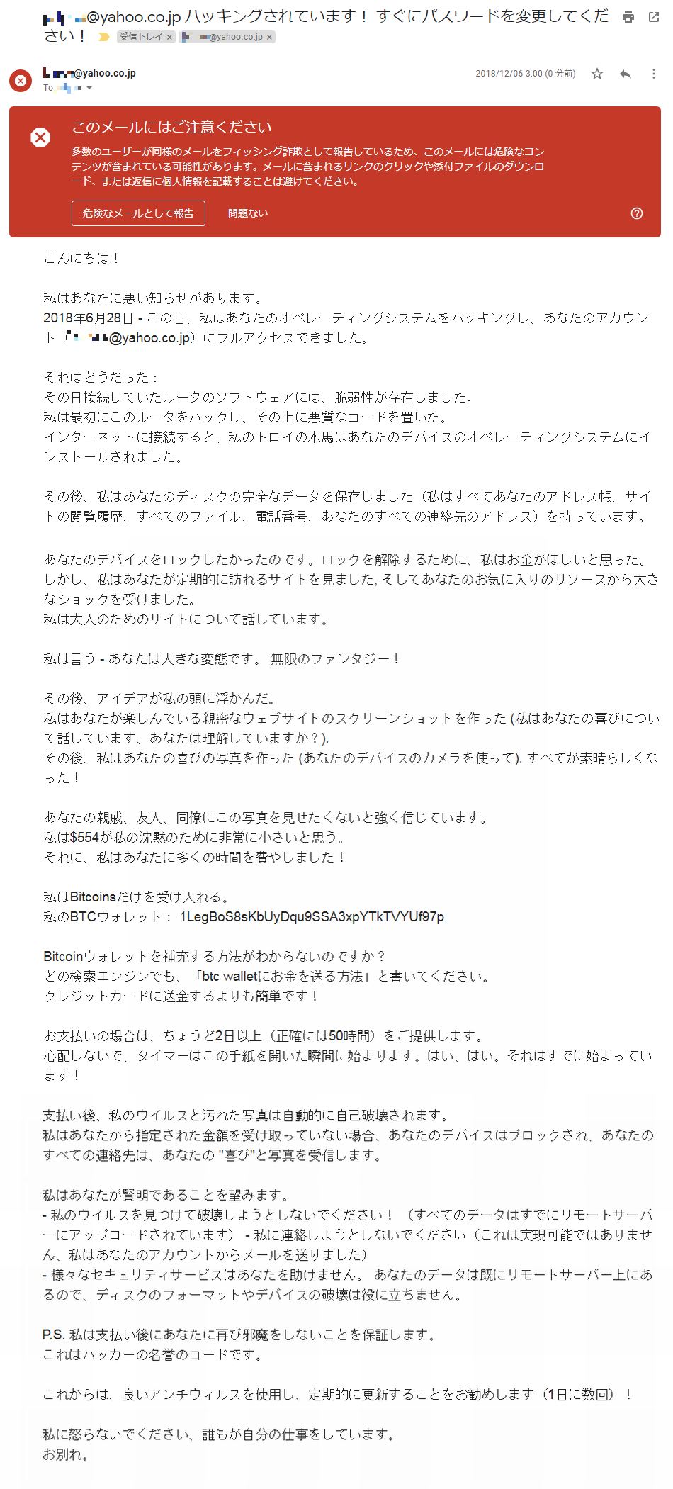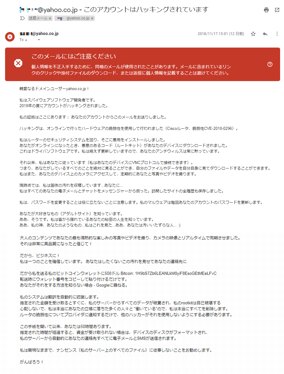 「メールアカウントをハッキングしたので、ビットコインを50時間以内に508ドル送れ。さもなければメール連絡先にあるすべての宛先にアダルトサイト閲覧の秘密をばらすぞ」といった内容。(左の画像をクリックすると全文表示) いかにも本当にハッキングしたかのような文面だが、メールシステムの仕組みを知っていればそんなことはハッキングした証拠にならないことは分かるので放置した。 厳に50日以上経過しても何の影響もない。 |